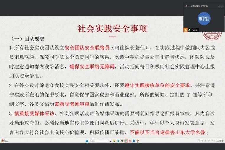 和有关地方部门服务学生成长就业、助力招才引智而实施的一项重要举措。通过参与“青鸟计划”,大家可以深入了解山东地区的发展需求,积累实践经验,拓宽就业渠道,为未来的职业发展打下坚实的基础。此外,刘明祖还重点强调了寒假社会实践的安全注意事项,提醒同学们在实践过程中要时刻保持高度的安全警觉,注意人身安全、财产安全和交通安全等,切实遵守实践单位的规章制度,听从队伍集体安排,做到风险防范。