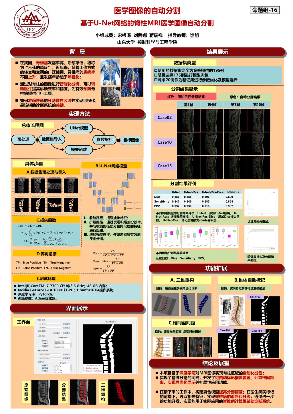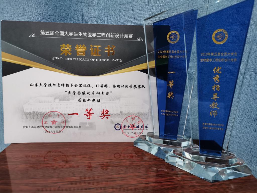 三名本科生宋根深、刘茜娜(生物医学工程2016级)和蒋瑞祥(理工复合班2017级)在谯旭副教授的指导下设计的“基于U-Net网络的脊柱MRI医学图像自动分割”参加了人工智能命题组比赛。小组从程序结构设计、应用模块构建及多方位展示(墙报及PPT)等方面精心准备,尽力做到尽善尽美。决赛中经过紧张有序的答辩、现场演示、系统实时评测等环节,实测的图像分割精度高,该作品得到了评委老师的一致认可。为结合实际医生需求而开发的脊椎三维重构、椎骨自动标记及间距计算等功能也令评委老师眼前一亮,最终以优异成绩获得一等奖,谯旭老师获得优秀指导教师奖。