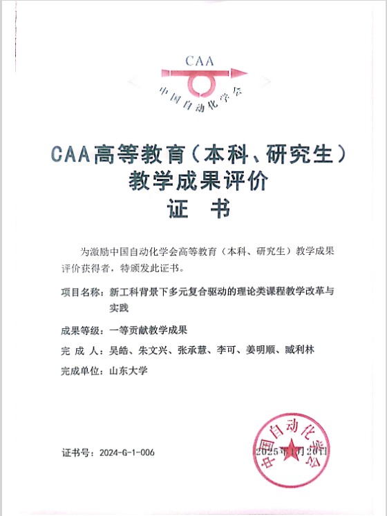 吴皓教授主持申报的“新工科背景下多元复合驱动的理论类课程教学改革与实践”项目(主要完成人:吴皓、朱文兴、张承慧、李可、姜明顺、臧利林)被评为“一等贡献教学成果”。
